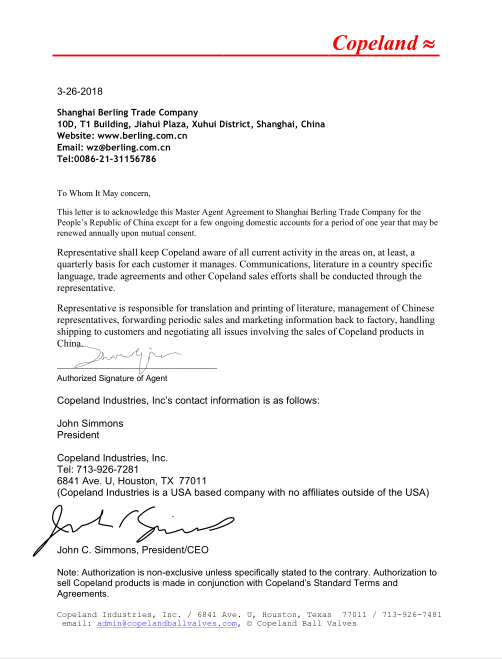 我公司于2017年獲得了Copeland代理授權